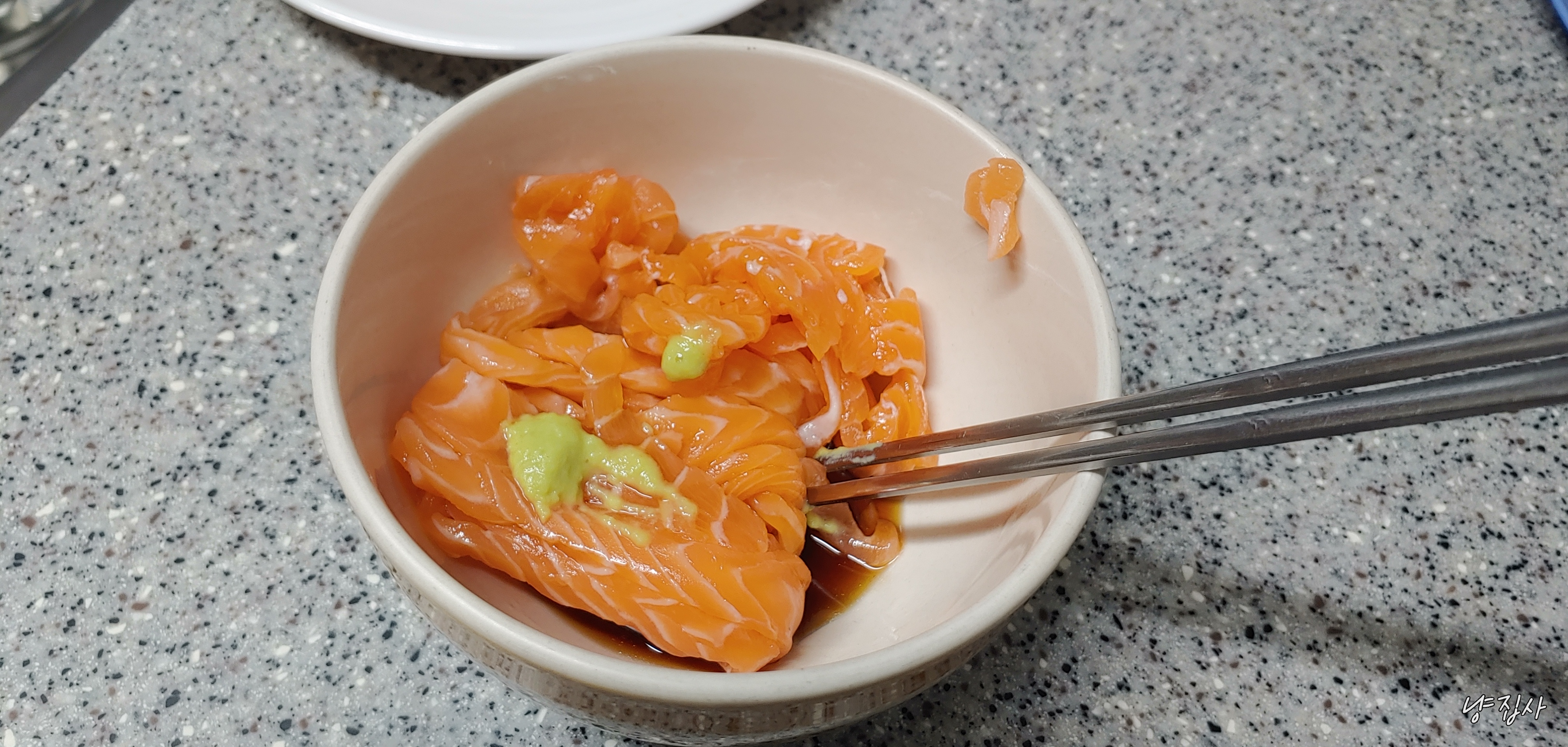 지금 먹는게 연어라는 것을 일께워 준다.