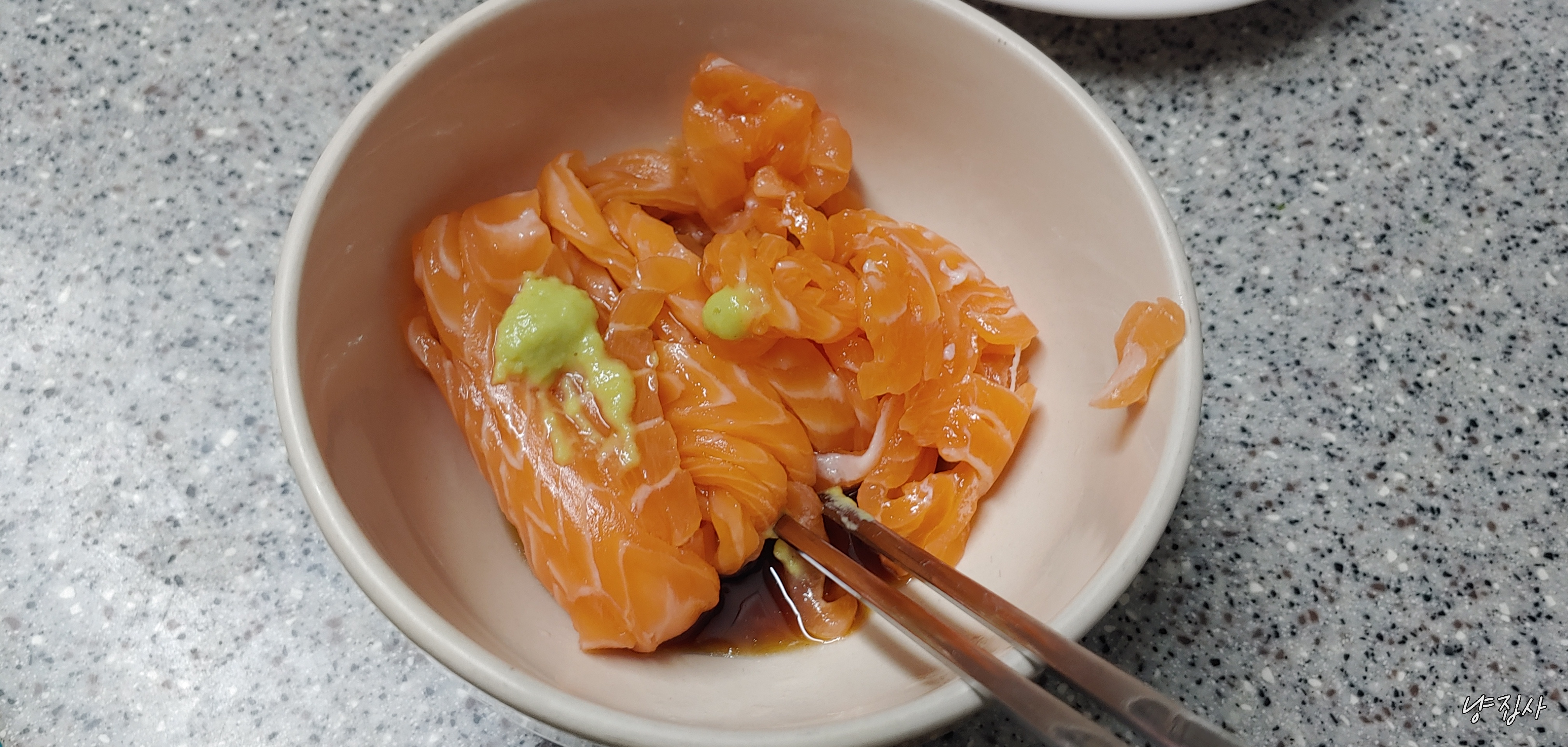 조미간장과 와사비를 털어 넣고